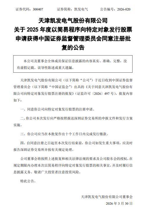 3月30日,凯发电气(300407.SZ)早间公告,公司于近日收到中国证监会出具的《关于同意天津凯发电气股份有限公司向特定对象发行股票注册的批复》,同意公司向特定对象发行股票的注册申请。